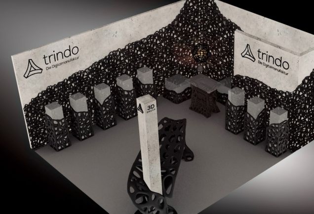 Wie ein derartig gestalteter Messestand aussehen kann, wurde auf der Viscom Messe in Düsseldorf demonstriert. Die Trindo GmbH aus München hat dort ihren Stand präsentiert. Dabei handelte es sich um eine aus Sand gefertigte Konstruktion, die mithilfe des 3D-Druckverfahrens realisiert wurde.